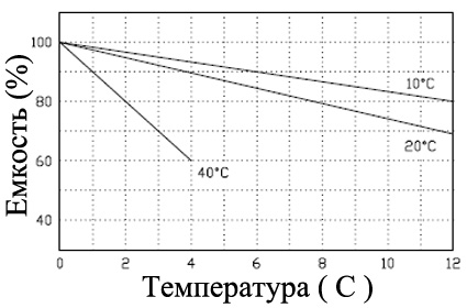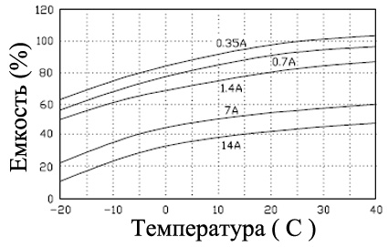 Зависимость емкости батареи аккумуляторной батареи/аккумулятора Hi-Watt LA 1270 от температуры при различных значениях силы тока