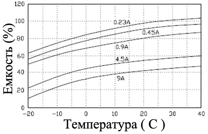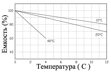 Зависимость емкости батареи аккумуляторной батареи/аккумулятора Hi-Watt LA 645 от температуры при различных значениях силы тока