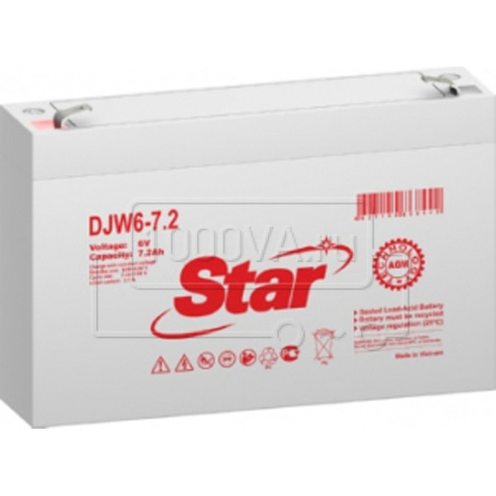 STAR DJW6-7.2 - необслуживаемый герметизированный аккумулятор с абсорбированным электролитом (изготовлен по технологии AGM). Обладает низкой величиной саморазряда. Аккумулятор подходит для предоставления резервного электропитания для систем безопасности и пожарной сигнализации, телекоммуникационных устройств и оборудования для связи, а также различных промышленных объектов, функционирования в источниках бесперебойного питания (ИБП). Расчетный срок службы - 8 лет.