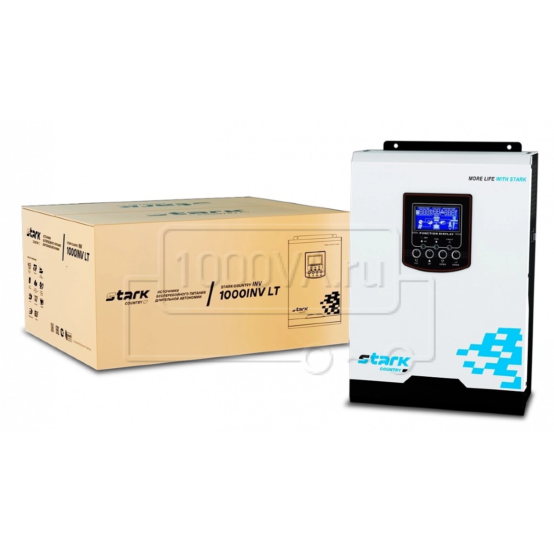 Stark Country 1000INV LT — бестрансформаторный инвертор с зарядным устройством (ЗУ) (off-line ИБП). Модель оснащена встроенным контроллером для работы с солнечными панелями, может успешно работать со всеми внешними контроллерами. ИБП работает в широком диапазоне входного напряжения, что позволяет реже использовать АКБ, таким образом продлевая ее срок службы. Имеется широкий диапазон настроек, которые пользователь может менять по своему усмотрению, в том числе "точная" настройка на конкретный тип АКБ, приоритет источника, напряжение перехода/возврата на АКБ, диапазон входного напряжения, логику работы контроллера и многое другое. Функция холодного старта позволяет автоматически включаться прибору и работать от АКБ при отсутствии входного напряжения сети или солнца. Возможность запуска после сбоя. Внешние АКБ приобретаются отдельно.